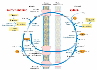 Gambar 1.2 Bagan pengangkutan acetyl-CoA dari mitokondria ke sitoplasma. Pyruvate hasilkatabolisme asam amino atau dari glikolisis glukosa diubah menjadi aecetyl-CoA oleh sistempyruvate dehydogenase. Gugus acetyl tersebut keluar matriks mitokondria sebagai citrate, masuk kesitosol untuk sintesis asam lemak. Oxaloacetate direduksi menjadi malate kembali ke matriksmitokondrion dan diubah kembali menjadi malate. Malat di sitosol dioksidasi oleh enzim malatmenghasilkan NADPH dan pyruvate. NADPH digunakan untuk reaksi reduksi dalam biosintesis asamlemak sedangkan pyrivate kembali ke matriks mitokondrion.